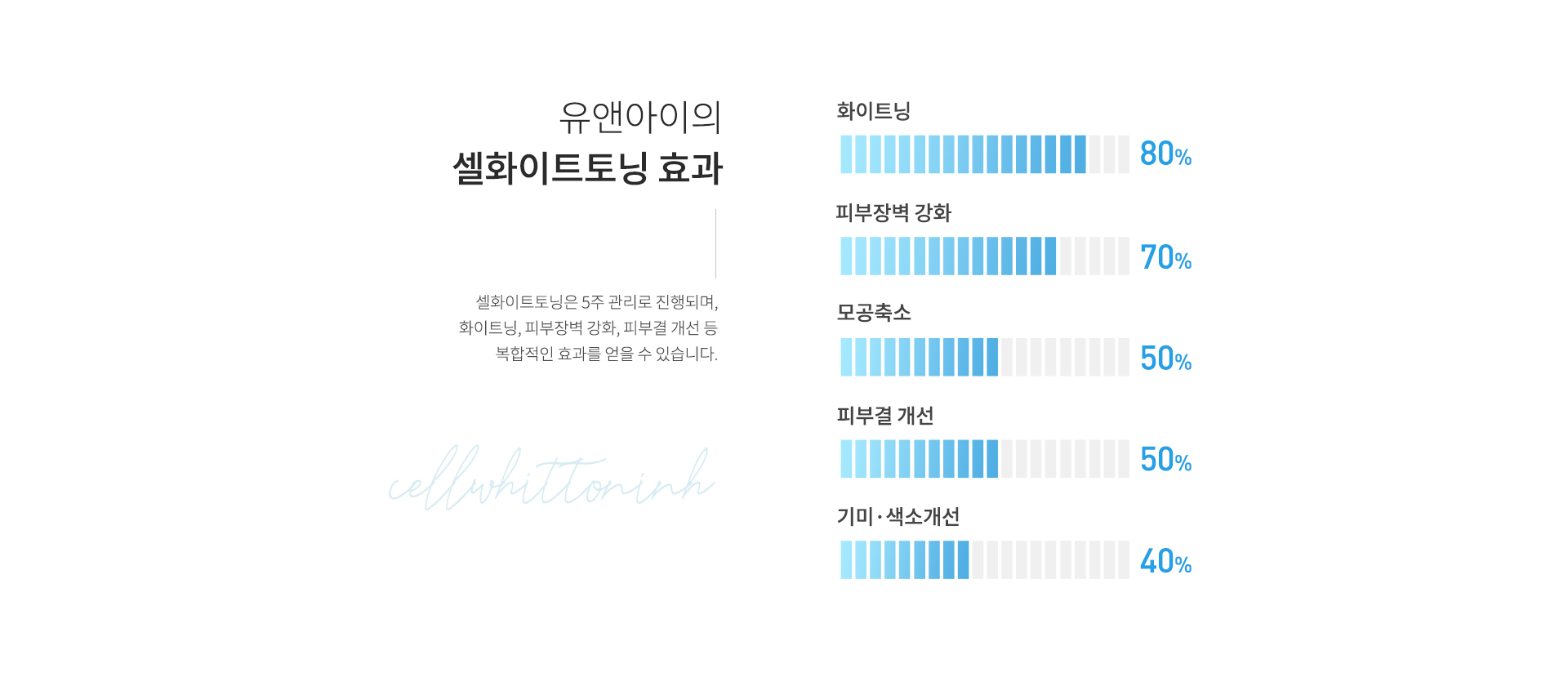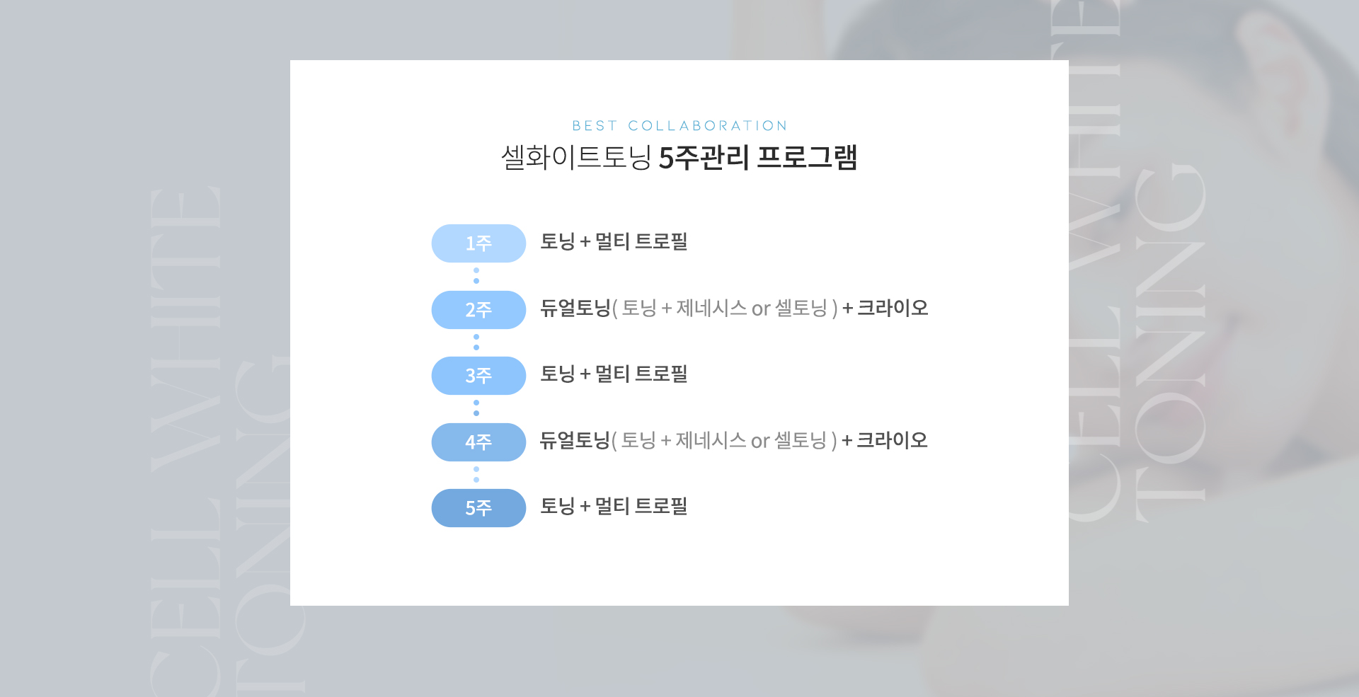 셀화이트토닝은 5주 관리로 진행되며, 화이트닝, 피부장벽 강화, 피부결 개선 등 복합적인 효과를 얻을 수 있습니다.